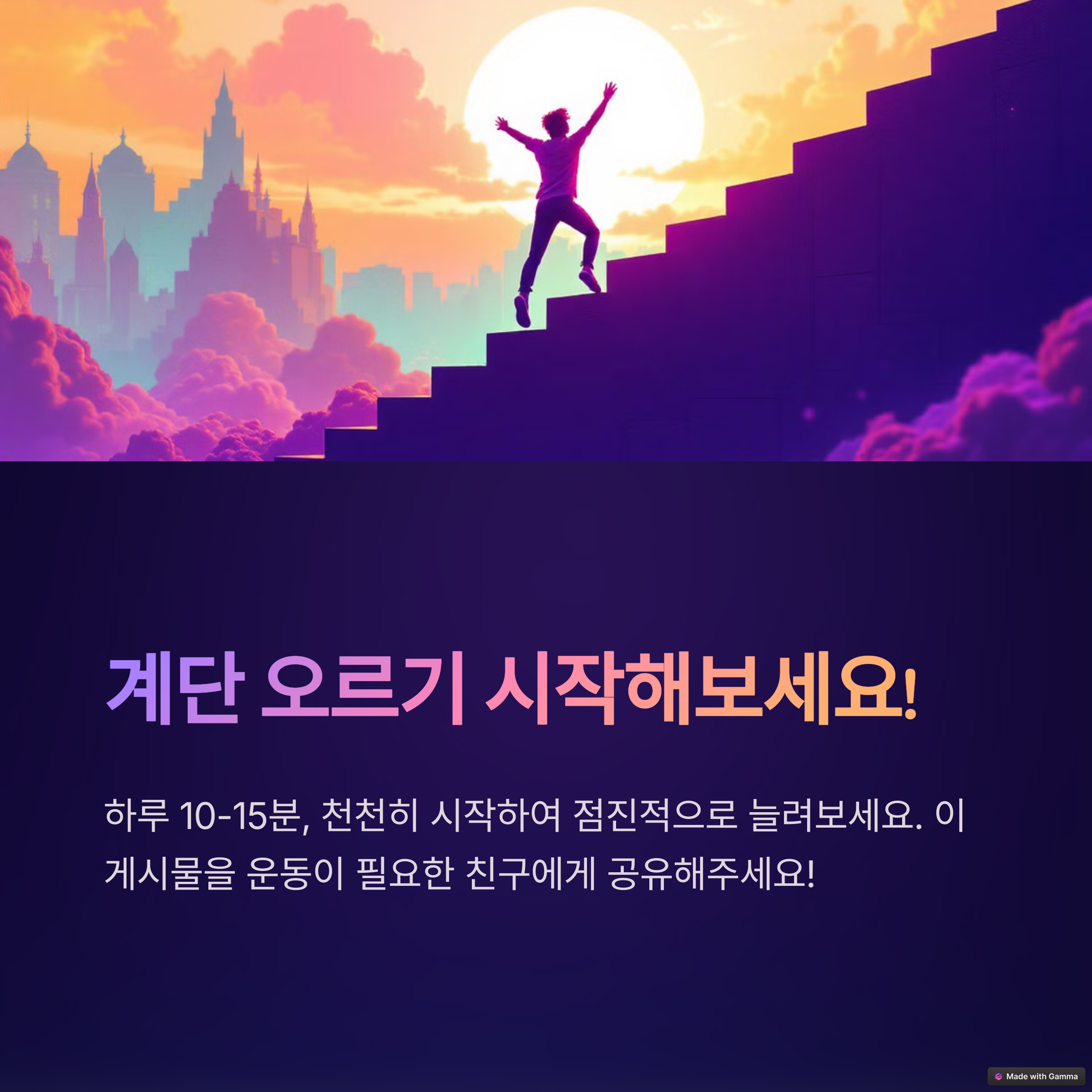 - 초보자: 한 계단씩 천천히 오르기 (10~15분)