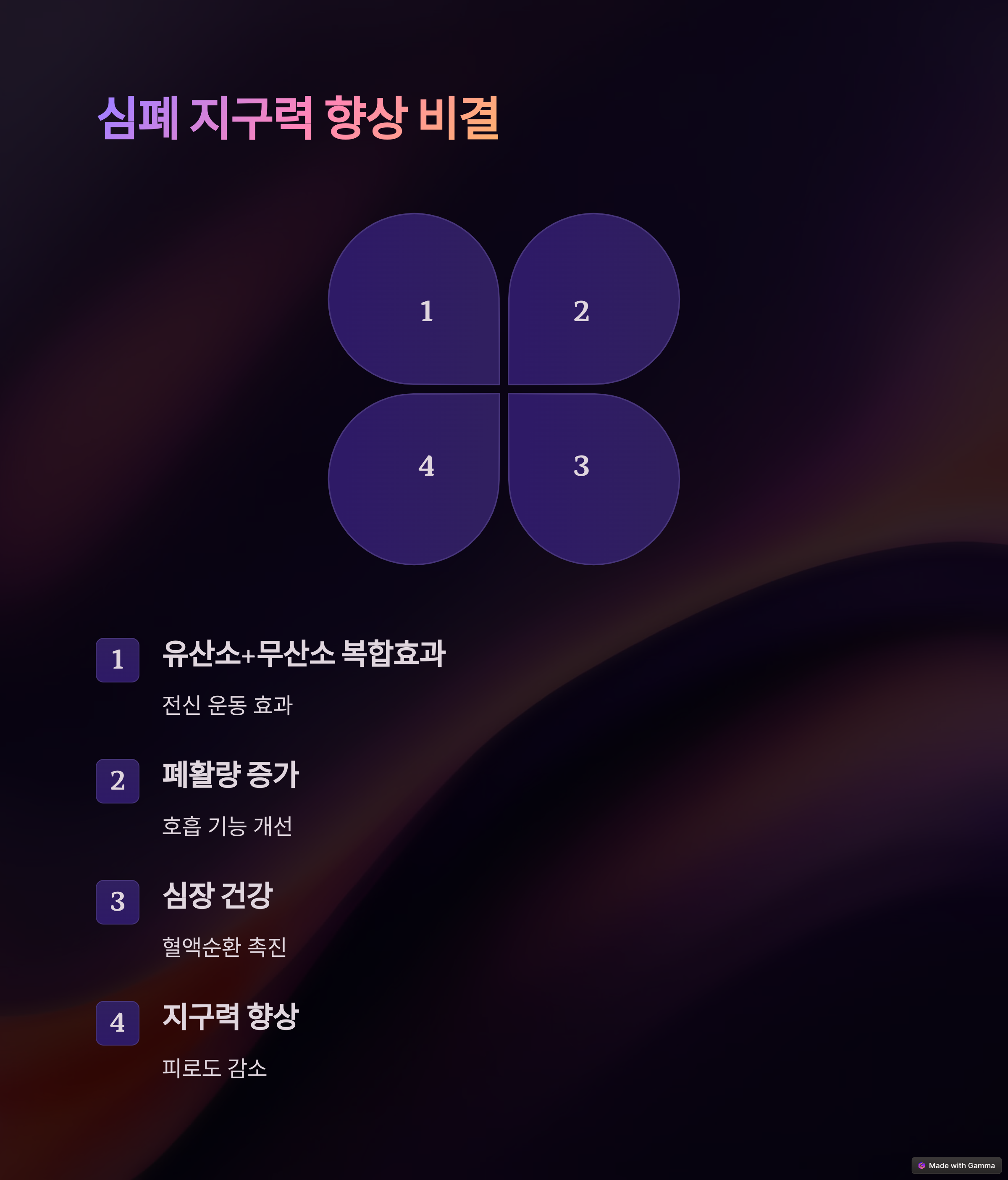 - 고급자: 계단 오르기 + 점프(인터벌 트레이닝)