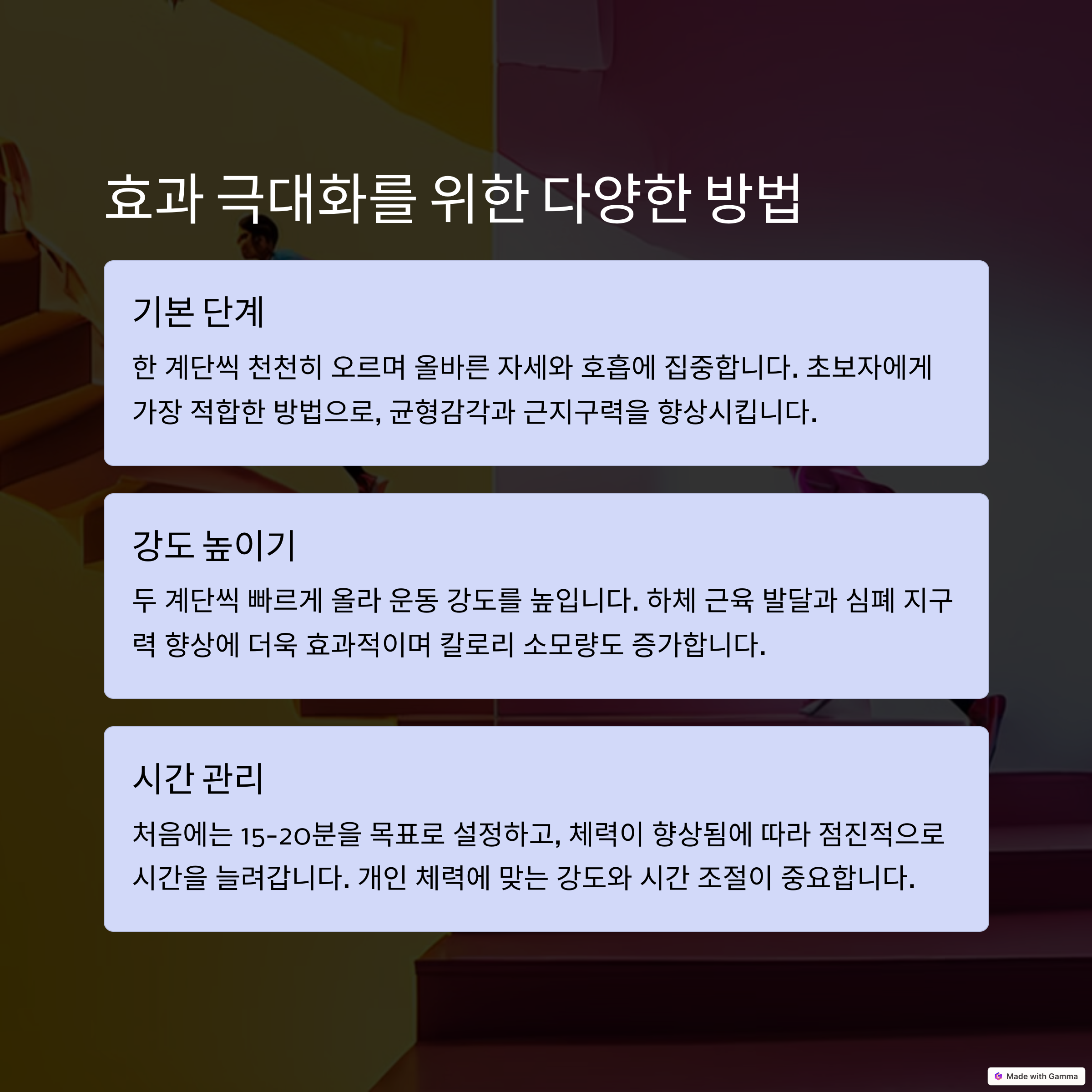 운동 효과를 극대화하려면, 짧은 시간 안에 강도 높은 운동을 하는 것이 중요합니다. 계단 오르기는 몇 분만 해도 숨이 차고, 심장이 빠르게 뛰면서 강도 높은 운동이 됩니다.