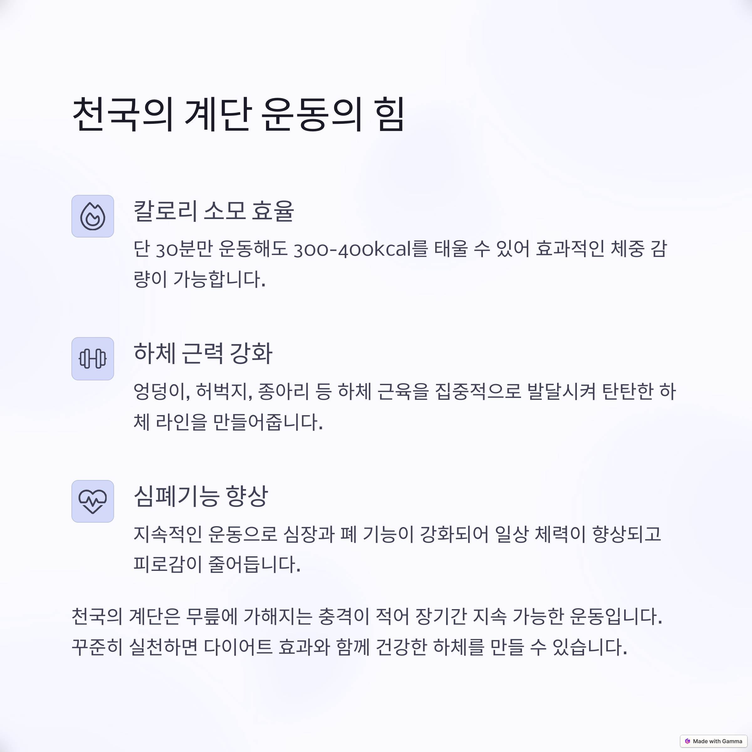 - ✔ 하체 근력을 키우면서 유산소 효과까지 얻고 싶다면? → 천국의 계단 추천!