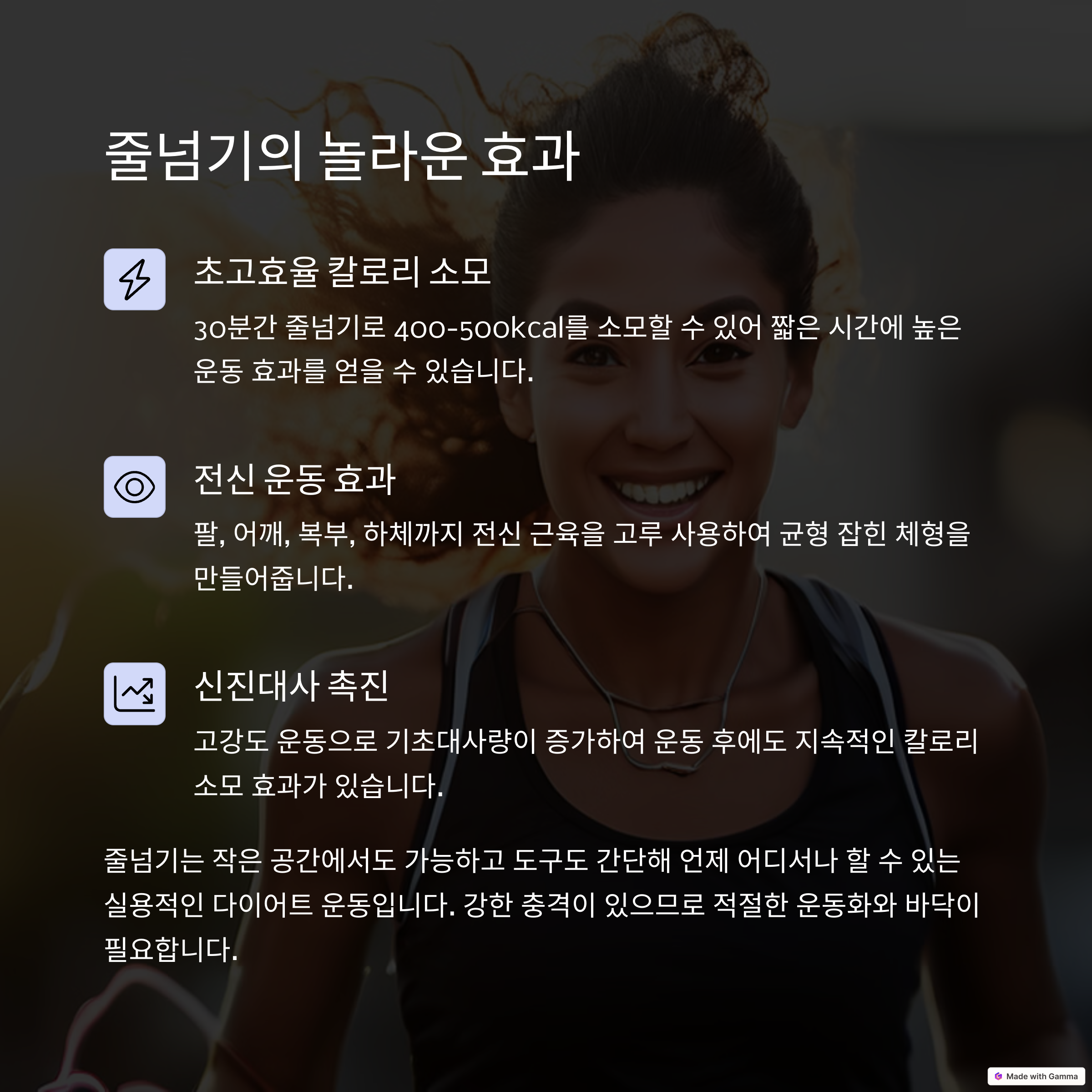 - ✅ 체지방 감소: 짧은 시간 내 고칼로리 소모