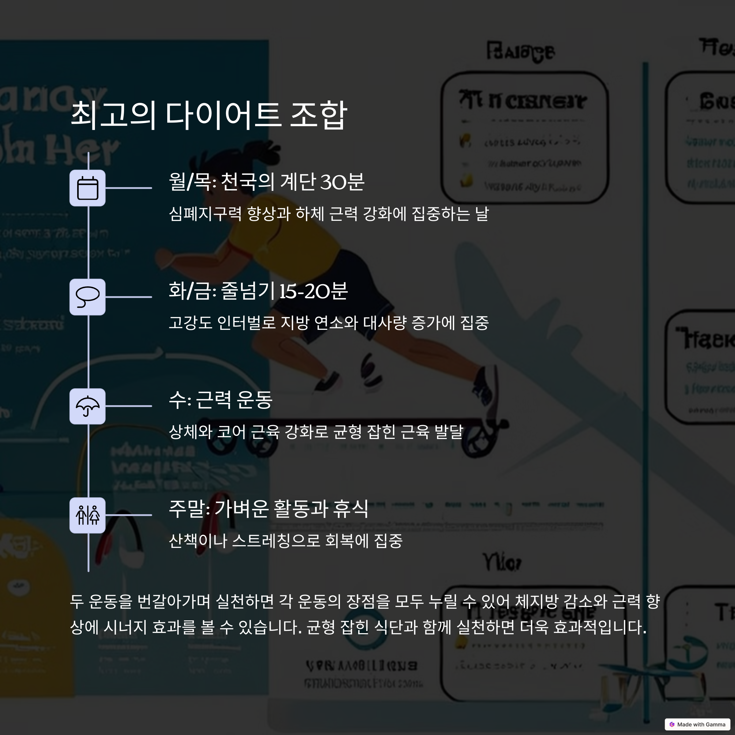 두 가지 운동을 병행하면 더욱 높은 다이어트 효과를 얻을 수 있습니다. 즐겁게 운동을 지속해보세요! 😊
